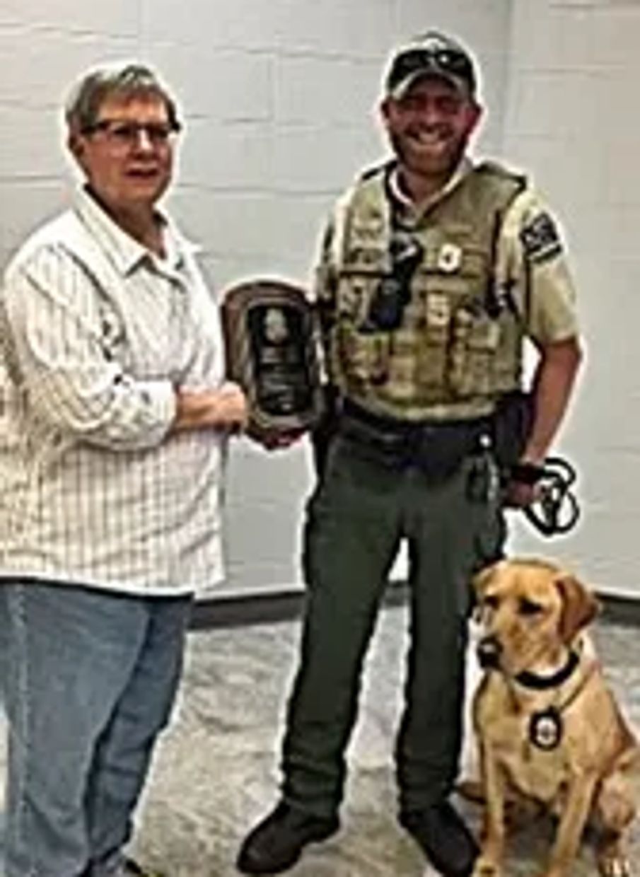 Garden City Kennel Club President, Amanda Shaw is being presented with a plaque by Game Warden Coleman to show appreciation for their monetary donation to purchase K9 Riggs in 2021. Game Warden Coleman and KDWP want to extend their gratitude to Garden City Kennel Club for their continued support to KDWP and the K9 unit.